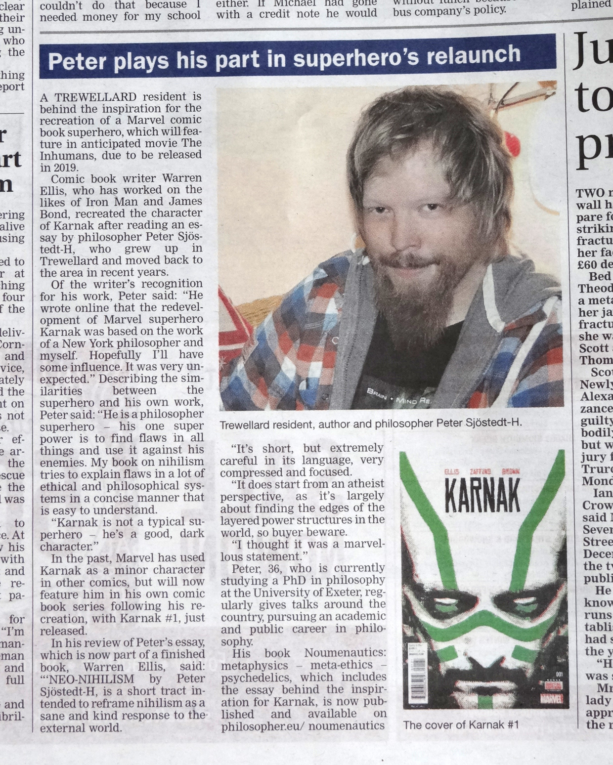 Peter Sjöstedt-H TEDx Talk: Consciousness and PsychedelicsThe Noumenaut – 3:am Magazine interviews Peter Sjöstedt-HOn Peter Sjöstedt-H’s influence on Marvel philosopher superhero Karnak.Click for Podcast interview on Youtube – on philosophy of mind, panpsychism, nihilism and psychedelic phenomenology.Noumenautics was the March 2016 book club selection of the Neurosoup organisation.Metanoia Magazine – includes article on Nietzsche’s Will to Power by Sjöstedt-H (pp18–22)A Psychedelic Revaluation of All Values – interview may 2016The Philosophy of Organism by Sjöstedt-H – in Philosophy Now, issue 114ICPR2016 conference interview, AmsterdamSjöstedt-H interviewed by Marvel legend Warren EllisSjöstedt-H interview for Inside the Rift on the Philosophy of PsychedelicsSjöstedt-H interviewed by Open Air AtheistEnpsychedelia interviews Peter Sjöstedt-HPsychedelic Influence on Philosophy – High Existence articleThe Catacombic Machine talks to Peter Sjöstedt-HPeter Sjöstedt-H interview written into an article for popular Quartz newspaper (August 2017)